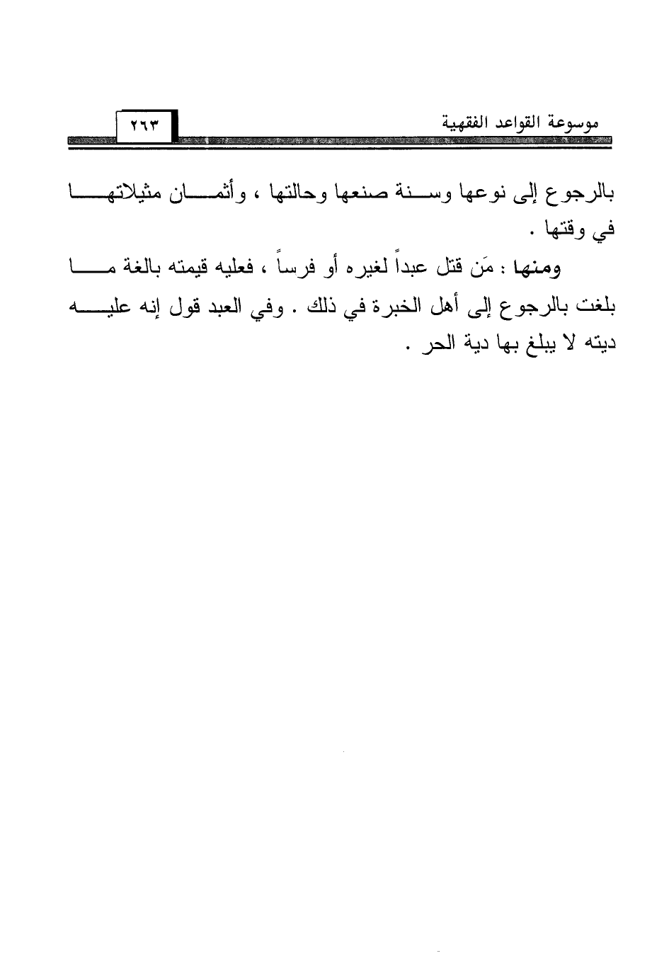 ومنها: مَن قتل عبداً لغيره أو فرساً، فعليه قيمته بالغة ما بلغت بالرجوع إلى أهل الخبرة في ذلك. وفي العبد قول إنه عليه ديته لا يبلغ بها دية الحر.