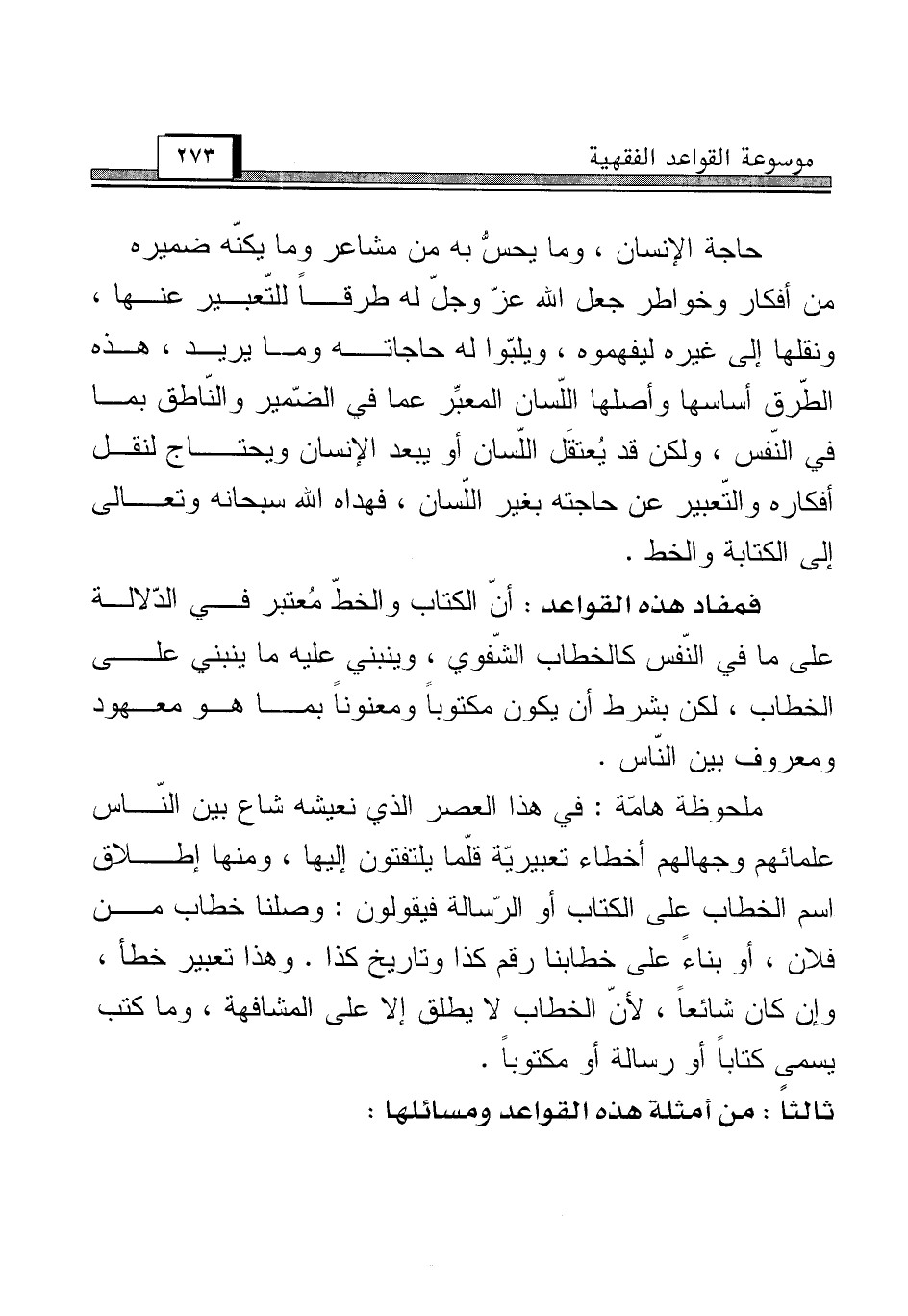 فمفاد هذه القواعد: أنّ الكتاب والخطّ مُعتبر في الدّلالة على ما في النّفس كالخطاب الشّفوي، وينبني عليه ما ينبني على الخطاب، لكن بشرط أن يكون مكتوباً ومعنوناً بما هو معهود ومعروف بين النّاس.