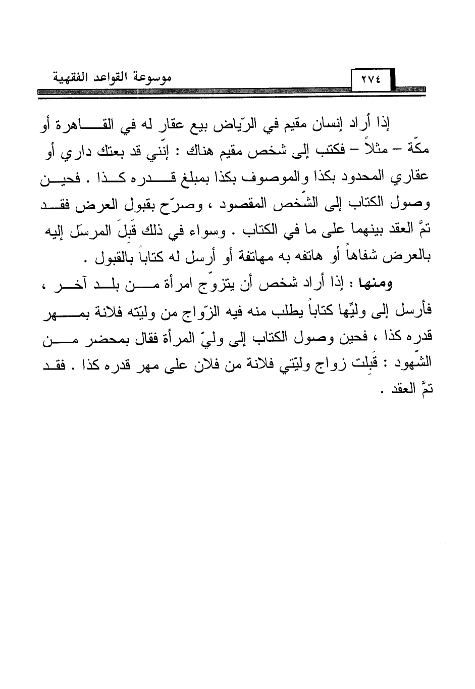 ومنها: إذا أراد شخص أن يتزوّج امرأة من بلد آخر، فأرسل إلى وليِّها كتاباً يطلب منه فيه الزّواج من وليّته فلانة بمهر قدره كذا، فحين وصول الكتاب إلى وليّ المرأة فقال بمحضر من الشّهود: قَبِلت زواج وليّتي فلانة من فلان على مهر قدره كذا. فقد تمَّ العقد.