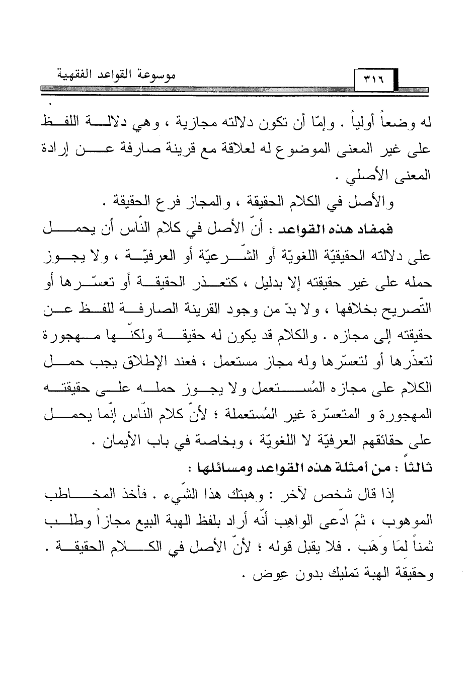 فمفاد هذه القواعد: أنّ الأصل في كلام النّاس أن يحمل على دلالته الحقيقيّة اللغويّة أو الشّرعيّة أو العرفيّة، ولا يجوز حمله على غير حقيقته إلا بدليل، كتعذر الحقيقة أو تعسّرها أو التّصريح بخلافها، ولا بدّ من وجود القرينة الصارفة للفظ عن حقيقته إلى مجازه. والكلام قد يكون له حقيقة ولكنّها مهجورة لتعذّرها أو لتعسّرها وله مجاز مستعمل، فعند الإطلاق يجب حمل الكلام على مجازه المُستعمل ولا يجوز حمله على حقيقته المهجورة والمتعسّرة غير المُستعملة؛ لأن كلام النّاس إنّما يحمل على حقائقهم العرفيّة لا اللغويّة، وبخاصة في باب الأيمان.