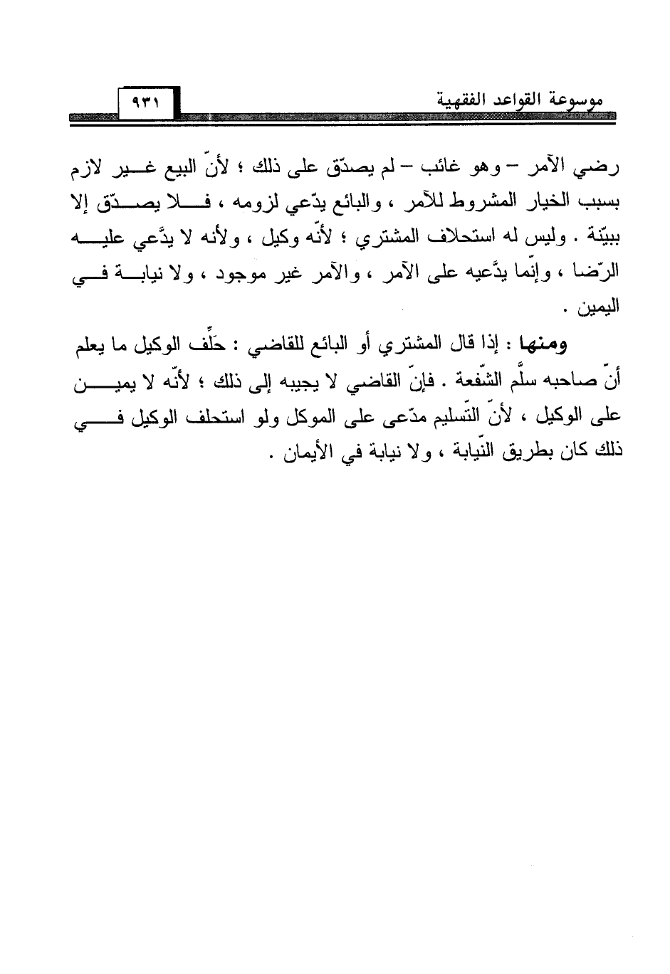 ومنها: إذا قال المشتري أو البائع للقاضي: حَلِّف الوكيل ما يعلم أنّ صاحبه سلَّم الشّفعة. فإنّ القاضي لا يجيبه إلى ذلك؛ لأنّه لا يمين على الوكيل، لأنّ التّسليم مدّعى على الموكل ولو استحلف الوكيل في ذلك كان بطريق النّيابة، ولا نيابة في الأيمان.