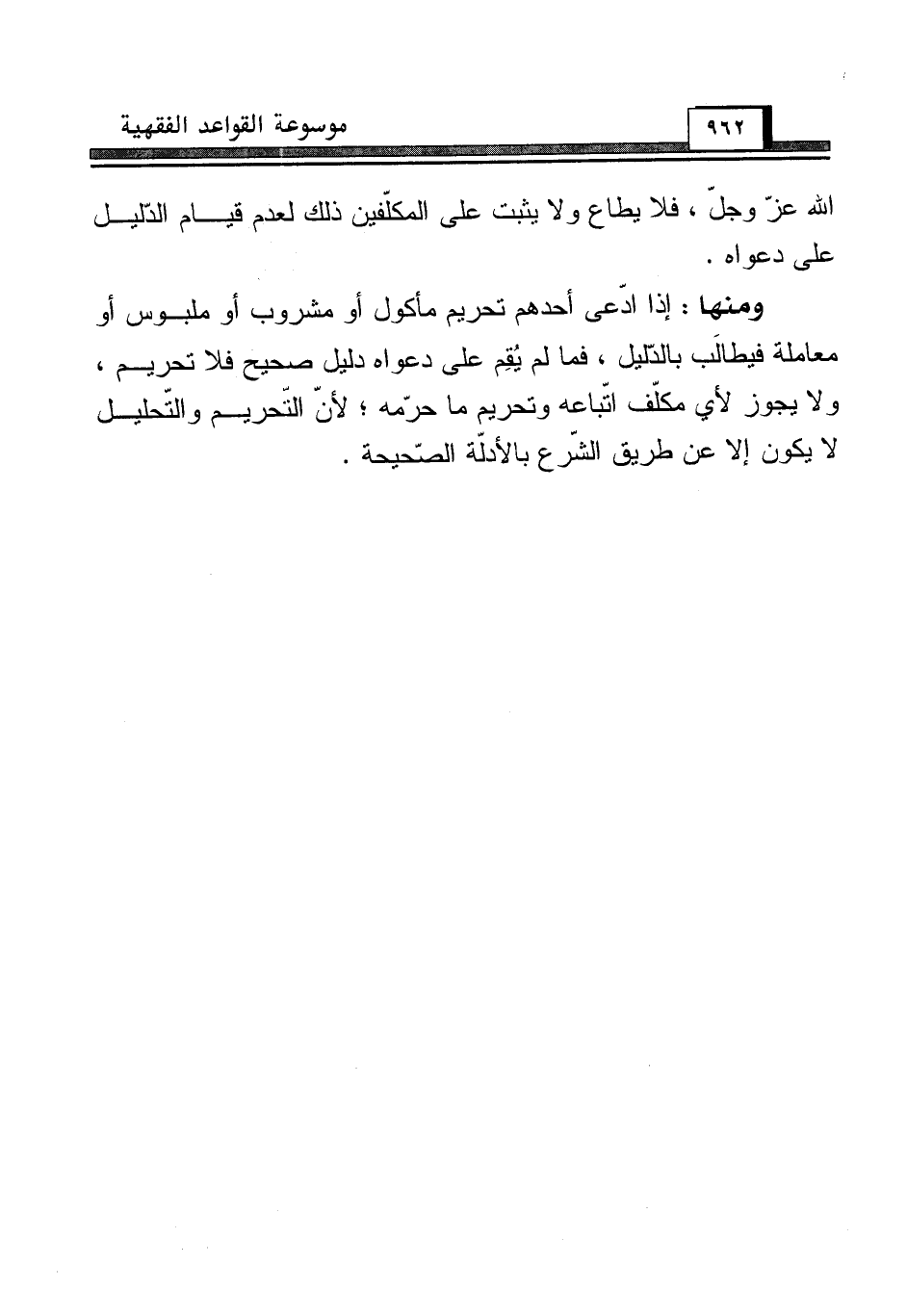 ومنها: إذا ادّعى أحدهم تحريم مأكول أو مشروب أو ملبوس أو معاملة فيطالَب بالدّليل، فما لم يُقِم على دعواه دليل صحيح فلا تحريم، ولا يجوز لأي مكلّف اتّباعه وتحريم ما حرّمه؛ لأنّ التحريم والتّحليل لا يكون إلا عن طريق الشّرع بالأدلّة الصّحيحة.