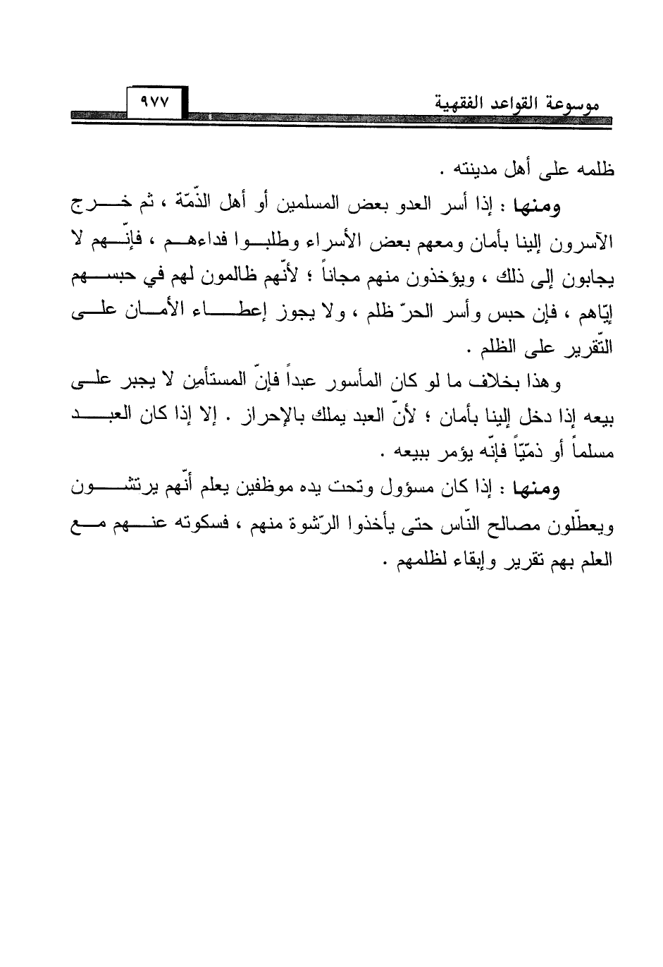 ومنها: إذا أسر العدو بعض المسلمين أو أهل الذّمّة، ثم خرج الآسرون إلينا بأمان ومعهم بعض الأسراء وطلبوا فداءهم، فإنّهم لا يجابون إلى ذلك، ويؤخذون منهم مجاناً؛ لأنّهم ظالمون لهم في حبسهم إيّاهم، فإن حبس وأسر الحرّ ظلم، ولا يجوز إعطاء الأمان على التّقرير على الظلم.