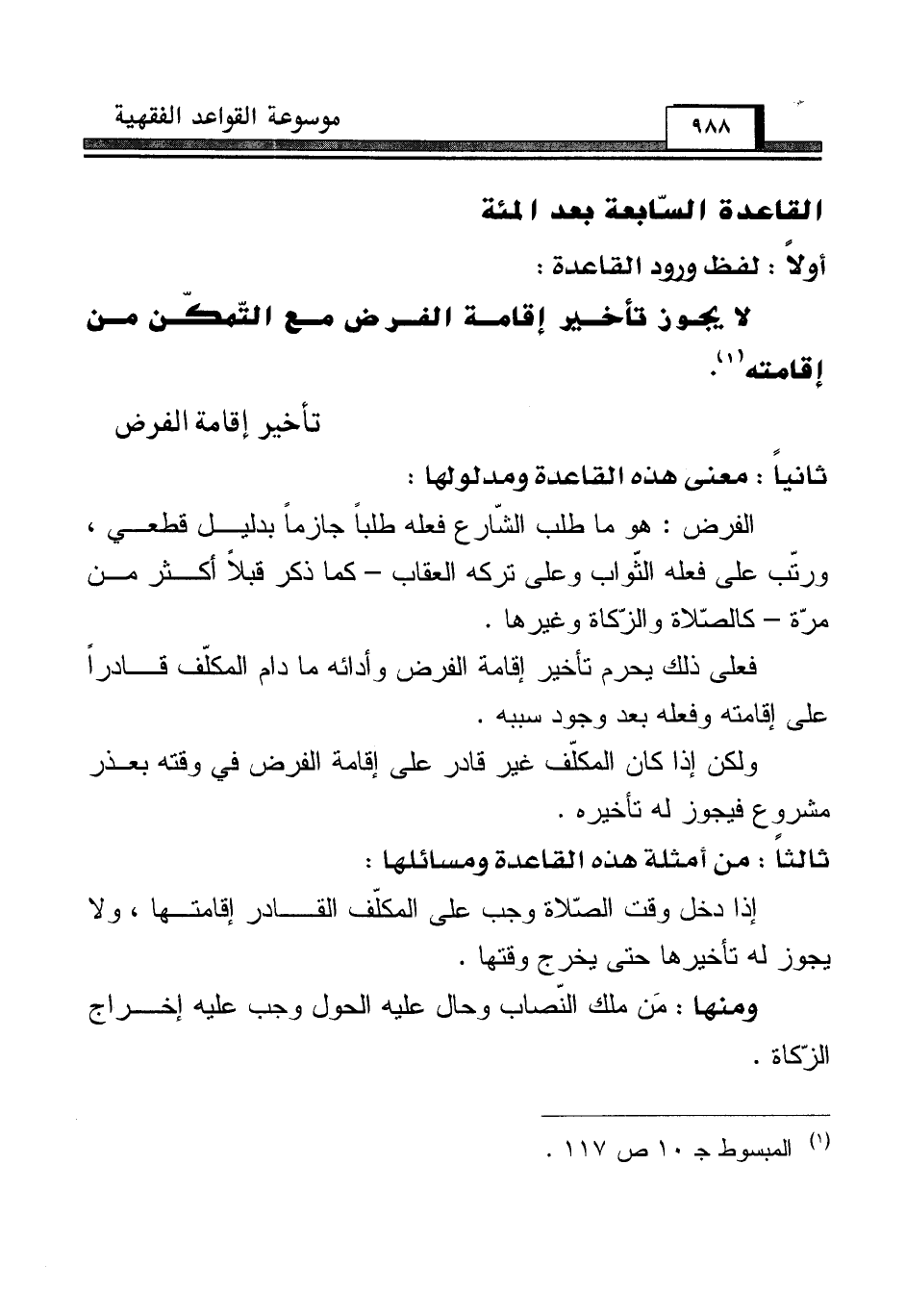 القاعدة السّابعة بعد المئة [تأخير إقامة الفرض]