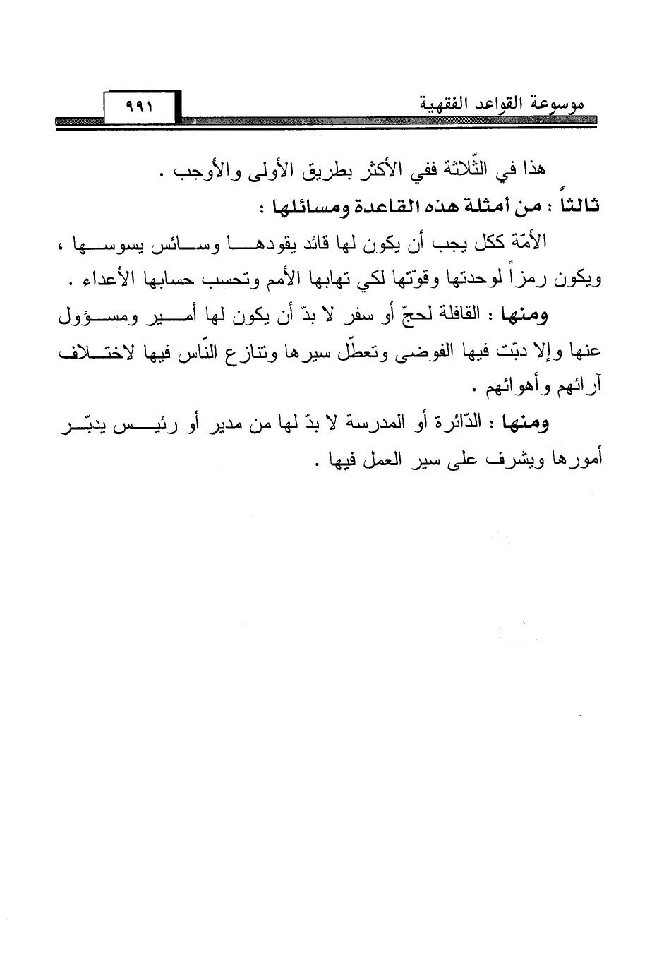 ومنها: القافلة لحجّ أو سفر لا بدّ أن يكون لها أمير ومسؤول عنها وإلا دبّت فيها الفوضى وتعطّل سيرها وتنازع النّاس فيها لاختلاف آرائهم وأهوائهم.
