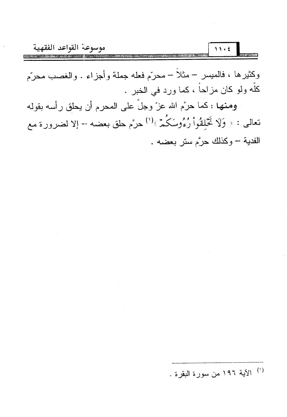 ومنها: كما حرَّم الله عزّ وجلّ على المحرم أن يحلق رأسه بقوله تعالى: {وَلَا تَحْلِقُوا رُءُوسَكُمْ} (¬1). حرَّم حلق بعضه - إلا لضرورة مع الفدية - وكذلك حرَّم ستر بعضه.
