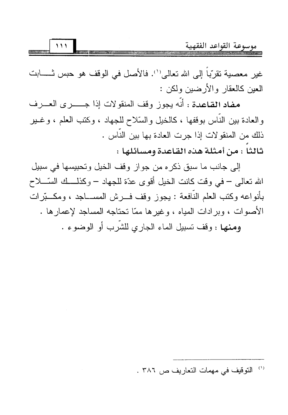 مفاد القاعدة: أنّه يجوز وقف المنقولات إذا جرى العرف والعادة بين النّاس بوقفها، كالخيل والسّلاح للجهاد، وكتب العلم، وغير ذلك من المنقولات إذا جرت العادة بها بين النّاس.