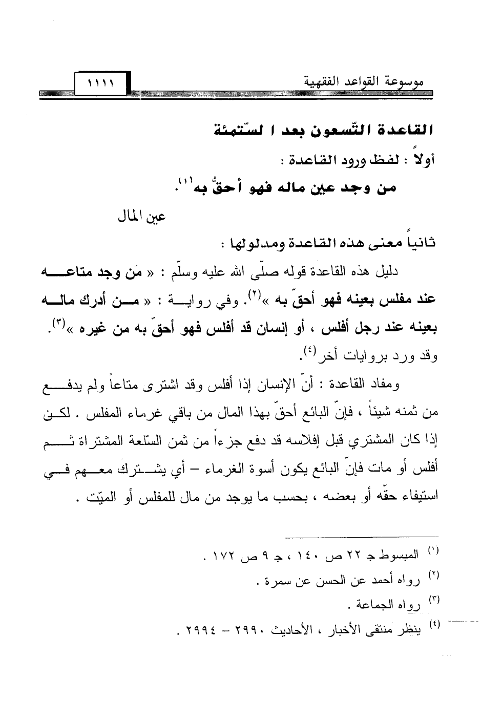 دليل هذه القاعدة قوله صلّى الله عليه وسلّم: "مَن وجد متاعه عند مفلس بعينه فهو أحقّ به" (¬2). وفي رواية: "من أدرك ماله بعينه عند رجل أفلس، أو إنسان قد أفلس فهو أحقّ به من غيره" (¬3). وقد ورد بروايات أخر (¬4).