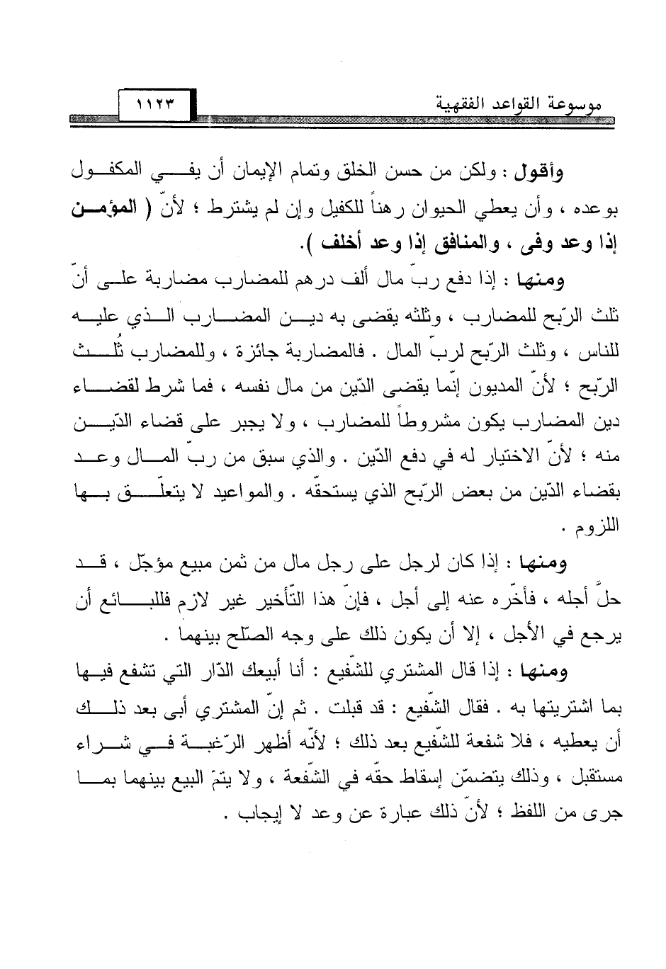 ومنها: إذا دفع ربّ مال ألف درهم للمضارب مضاربة على أنّ ثلث الرّبح للمضارب، وثلثه يقضى به دين المضارب الذي عليه للناس، وثلث الرّبح لربّ المال. فالمضاربة جائزة، وللمضارب ثُلث الرّبح؛ لأنّ المديون إنّما يقضى الدّين من مال نفسه، فما شرط لقضاء دين المضارب يكون مشروطاً للمضارب، ولا يجبر على قضاء الدّين منه؛ لأنّ الاختيار له في الدفع الدّين. والذي سبق من ربّ المال وعد بقضاء الدّين من بعض الرّبح الذي يستحقّه. والمواعيد لا يتعلّق بها اللزوم.
