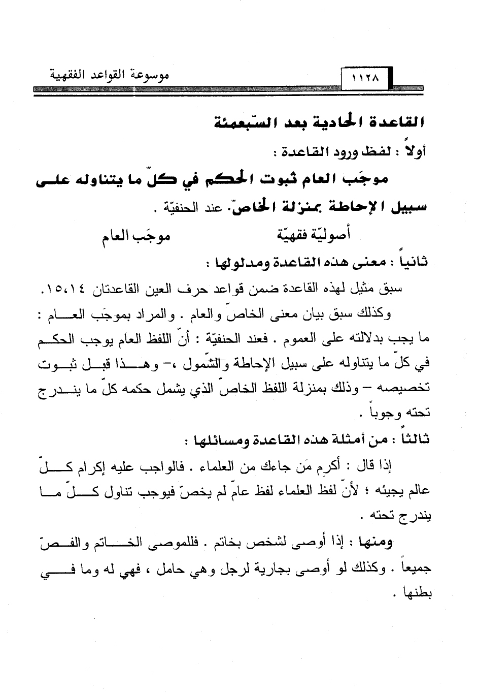 موجَب العام ثبوت الحكم في كلّ ما يتناوله على سبيل الإحاطة بمنزلة الخاصّ. عند الحنفيّة. [أصوليّة فقهيّة]