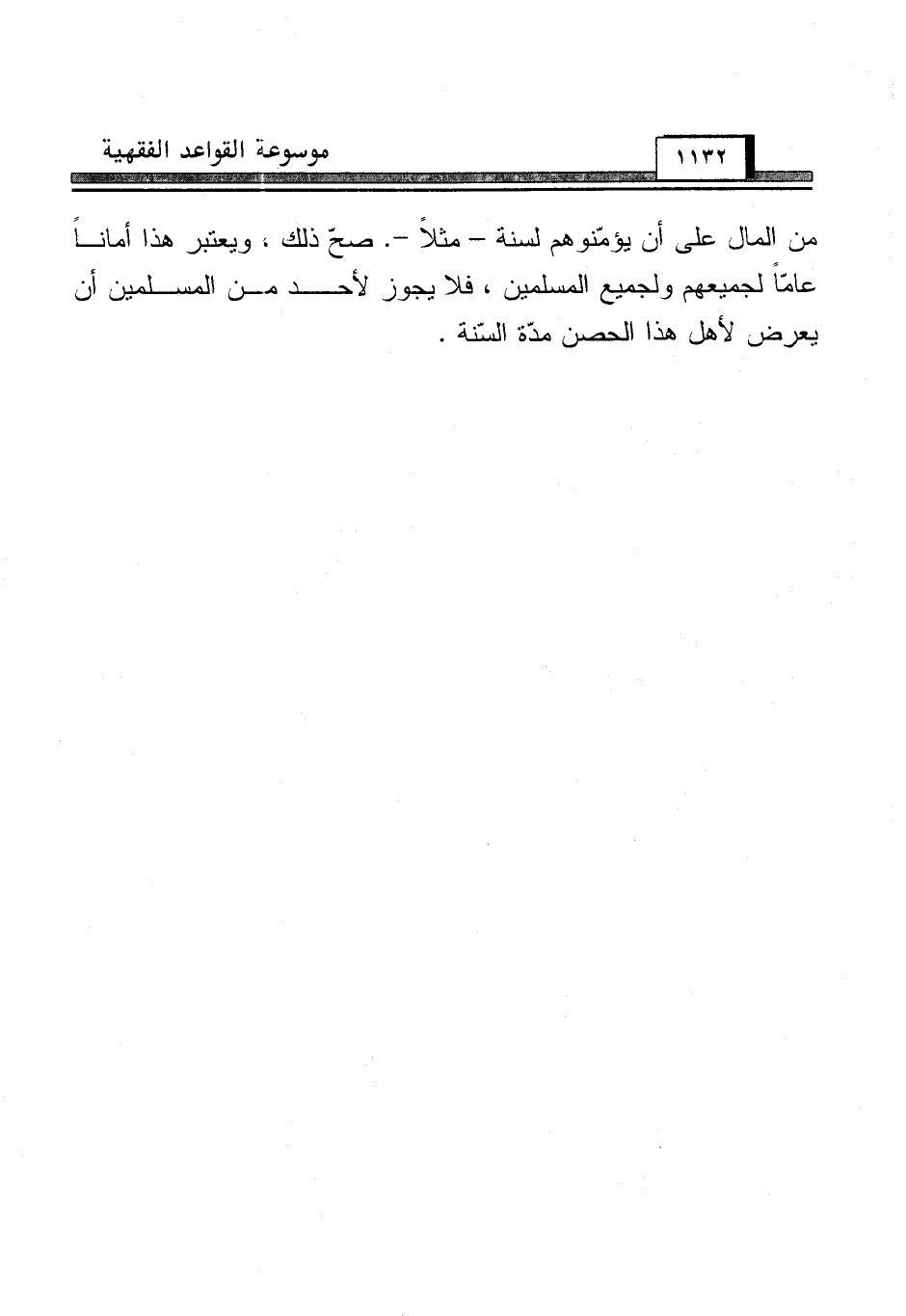من المال على أن يؤمّنوهم لسنة - مثلاً -. صحّ ذلك. ويعتبر هذا أماناً عامّاً لجميعهم ولجميع المسلمين، فلا يجوز لأحد من المسلمين أن يعرض لأهل هذا الحصن مدّة السّنة.