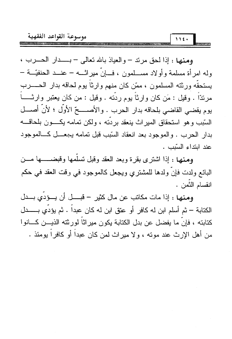 ومنها: إذا مات مكاتب عن مال كثير - قبل أن يؤدّي بدل الكتابة - ثم أسلم ابن له كافر أو عتق ابن له كان عبداً. ثم يؤدّي بدل كتابته، فإنّ ما يفضل عن بدل الكتابة يكون ميراثاً لورثته الذين كانوا من أهل الإرث عند موته، ولا ميراث لمن كان عبداً أو كافراً يومئذ.