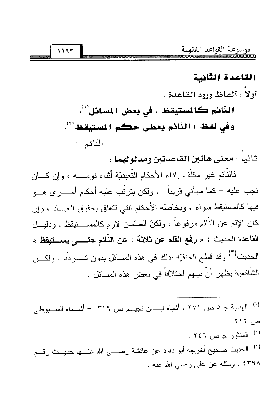 فالنّائم غير مكلّف بأداء الأحكام التّعبديّة أثناء نومه، وإن كان تجب عليه - كما سيأتي قريباً -. ولكن يترتّب عليه أحكام أخرى هو فيها كالمستيقظ سواء، وبخاصّة الأحكام التي تتعلّق بحقوق العباد، وإن كان الإثم عن النّائم مرفوعاً، ولكنّ الضّمان لازم كالمستيقظ. ودليل القاعدة الحديث: "رفع القلم عن ثلاثة: عن النّائم حتى يستيقظ" الحديث (¬3) وقد قطع الحنفيّة بذلك في هذه المسائل بدون تردّد. ولكن الشّافعية يظهر أنّ بينهم اختلافاً في بعض هذه المسائل.
