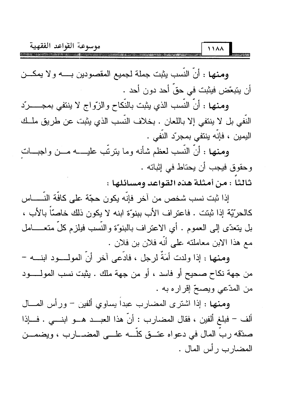 ومنها: أنّ النّسب يثبت جملة لجميع المقصودين به ولا يمكن أن يتبعّض فيثبت في حقّ أحد دون أحد.