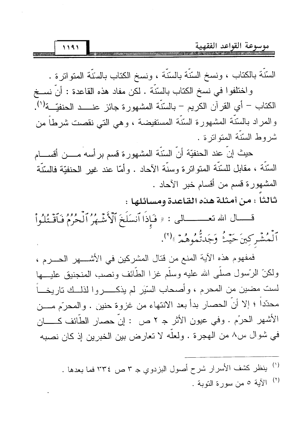 فمفهوم هذه الآية المنع من قتال المشركين في الأشهر الحرم، ولكنّ الرّسول صلّى الله عليه وسلم غزا الطّائف ونصب المنجنيق عليها لست مضين من المحرم، وأصحاب السّيَر لم يذكروا لذلك تاريخاً محدّداً؛ إلا انّ الحصار بدأ بعد الانتهاء من غزوة حنين. والمحرّم من الأشهر الحرُم. وفي عيون الأثر جـ 2 ص: إنّ حصار الطائف كان في شوال س 8 من الهجرة. ولعلّه لا تعارض بين الخبرين إذ كان نصبه