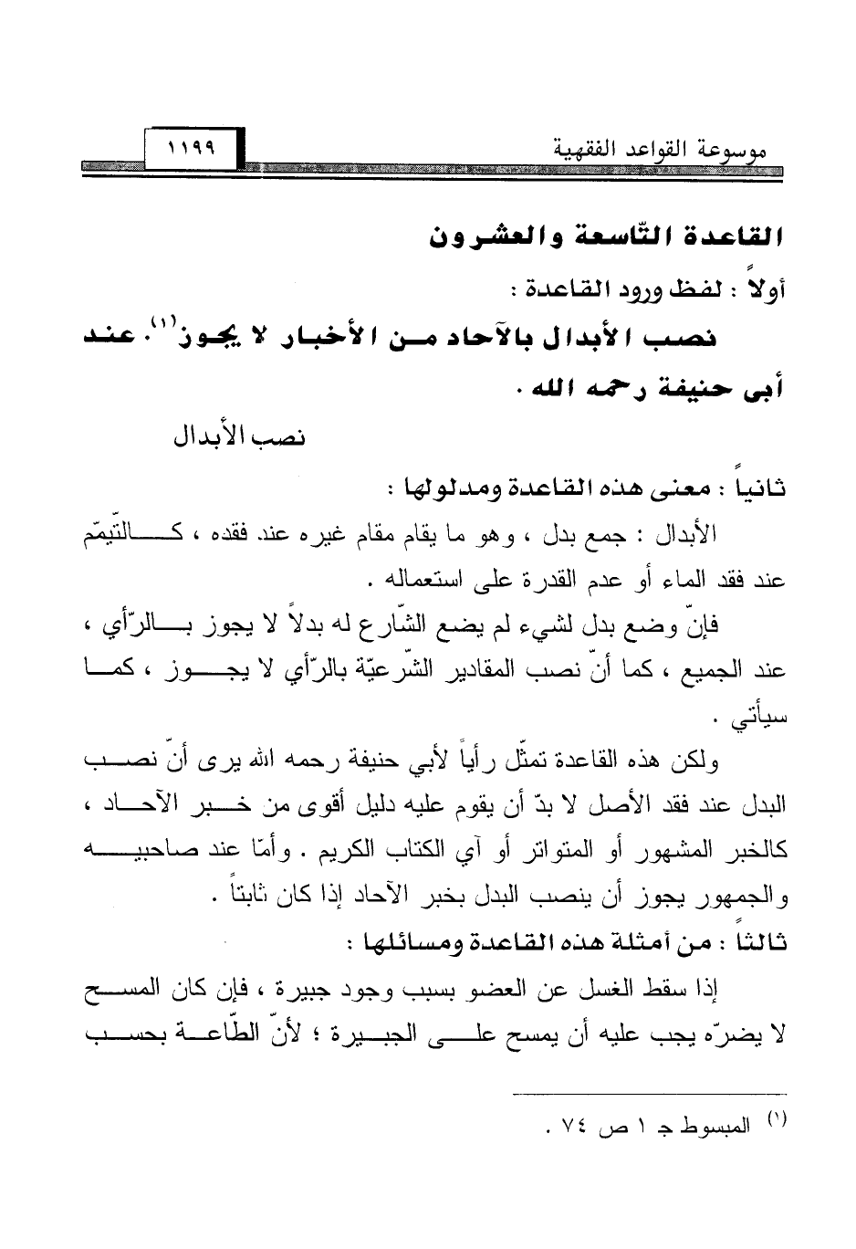ولكن هذه القاعدة تمثّل رأياً لأبي حنيفة رحمه الله يرى أنّ نصب البدل عند فقد الأصل لا بدّ أن يقوم عليه دليل أقوى من خبر الآحاد، كالخبر المشهور أو المتواتر أو آي الكتاب الكريم. وأمّا عند صاحبيه والجمهور يجوز أن ينصب البدل بخبر الآحاد إذا كان ثابتاً.