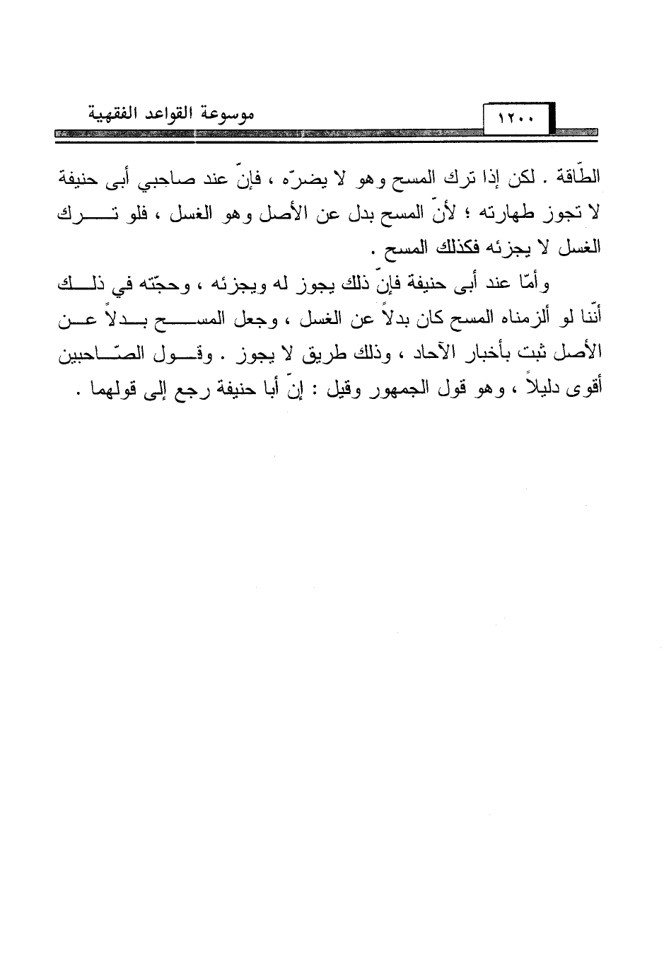 الطّاقة. لكن إذا ترك المسح وهو لا يضرّه، فإنّ عند صاحبي أبي حنيفة لا تجوز طهارته؛ لأنّ المسح بدل عن الأصل وهو الغسل، فلو ترك الغسل لا يجزئه فكذلك المسح.