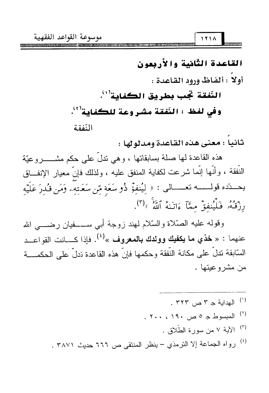 وقوله عليه الصّلاة والسّلام لهند زوجة أبي سفيان رضي الله عنهما: "خذي ما يكفيك وولدك بالمعروف" (¬4). فإذا كانت القواعد السّابقة تدلّ على مكانة النّفقة وحكمها فإنّ هذه القاعدة تدلّ على الحكمة من مشروعيتها.