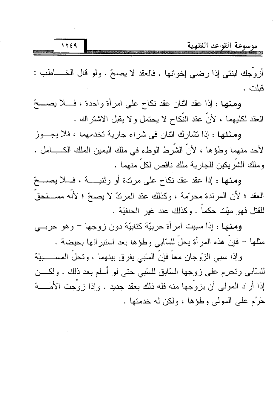 ومنها: إذا عقد اثنان عقد نكاح على امرأة واحدة، فلا يصحّ العقد لكليهما, لأنّ عقد النّكاح لا يحتمل ولا يقبل الاشتراك.