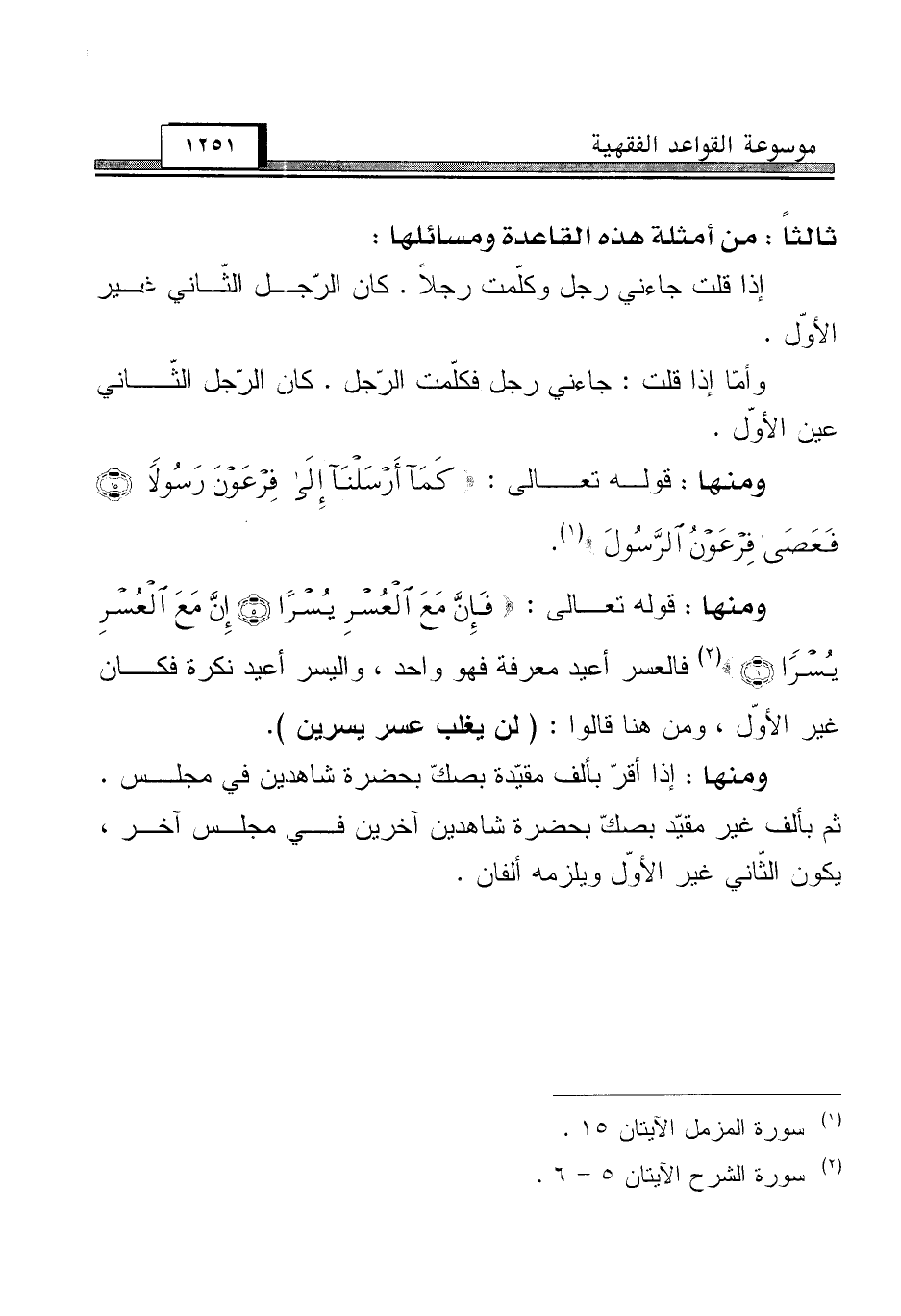 ومنها: قوله تعالى: {فَإِنَّ مَعَ الْعُسْرِ يُسْرًا (5) إِنَّ مَعَ الْعُسْرِ يُسْرًا (6)} (¬2) فالعسر أعيد معرفة فهو واحد، واليسر أعيد نكرة فكان غير الأوّل، ومن هنا قالوا: (لن يغلب عسر يسرين).