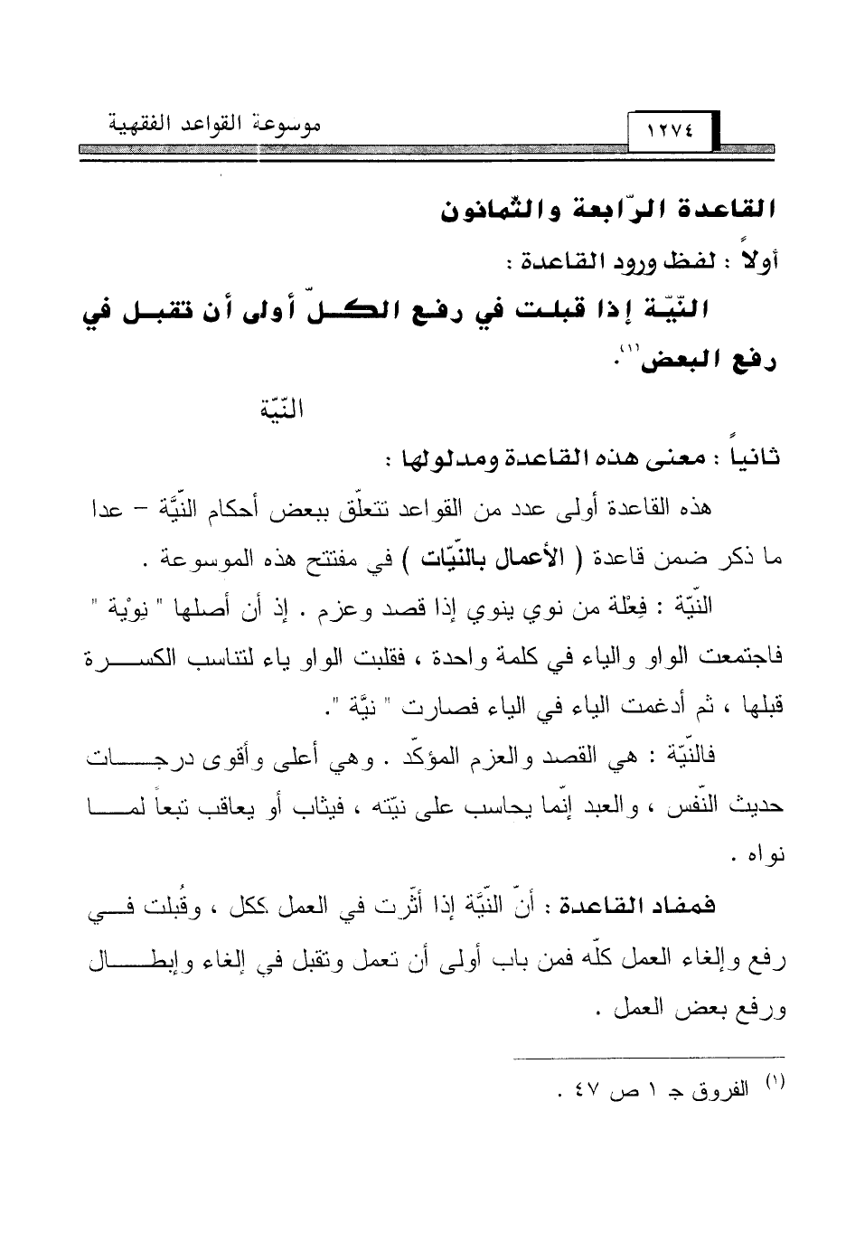 هذه القاعدة أولى عدد القواعد تتعلّق ببعض أحكام النّيَّة - عدا ما ذكر ضمن قاعدة (الأعمال بالنّيّات) في مفتتح هذه الموسوعة.