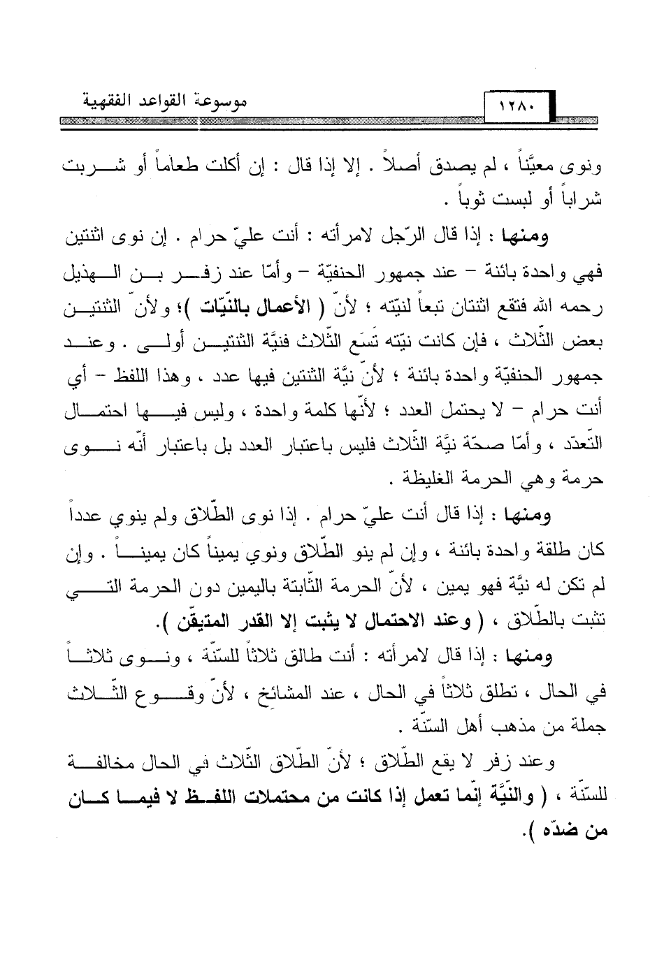 ومنها: إذا قال الرّجل لامرأته: أنت عليّ حرام. إن نوى اثنتين فهي واحدة بائنة - عند جمهور الحنفيّة - وأمّا عند زفر بن الهذيل رحمه الله فتقع اثنتان تبعاً لنيّته؛ لأنّ (الأعمال بالنّيّات)؛ ولأن الثنتين بعض الثّلاث، فإن كانت نيّته تسع الثّلاث فنيَّة الثنتين أولى. وعند جمهور الحنفية واحدة بائنة؛ لأنّ نيَّة الثنتين فيها عدد، وهذا اللفظ - أي أنت حرام - لا يحتمل العدد؛ لأنّها كلمة واحدة، وليس فيها احتمال التّعدّد، وأمّا صحّة نيَّة الثّلاث فليس باعتبار العدد بل باعتبار أنّه نوى حرمة وهي الحرمة الغليظة.
