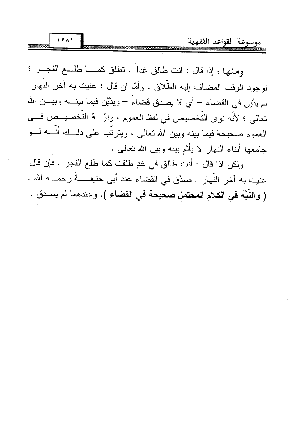 ومنها: إذا قال: أنت طالق غداً. تطلق كما طلع الفجر؛ لوجود الوقت المضاف إليه الطّلاق. وأمّا إن قال: عنيت به آخر النّهار لم يدَّين في القضاء - أي لا يصدق قضاءً - ويدَّيَّن فيما بينه وبين الله تعالى؛ لأنّه نوى التّخصيص في لفظ العموم، ونيَّة التّخصيص في العموم صحيحة فيما بينه وبين الله تعالى، ويترتّب على ذلك أنّه لو جامعها أثناء النّهار لا يأثم بينه وبين الله تعالى.