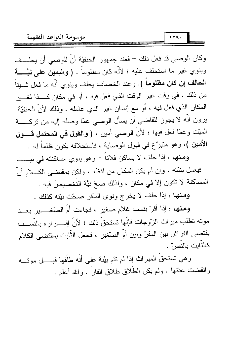 وكان الوصي قد فعل ذلك - فعند جمهور الحنفيّة أنّ للوصي أن يحلف وينوي غير ما استحلف عليه؛ لأنّه كان مظلوماً. (واليمين على نيَّة الحالف إن كان مظلوماً). وعند الخصاف يحلف وينوي أنّه ما فعل شيئاً من ذلك. في وقت غير الوقت الذي فعل فيه، أو في مكان كذا لغير المكان الذي فعل فيه، أو مع إنسان غير الذي عامله. وذلك لأنّ الحنفيّة يرون أنّه لا يجوز للقاضي أن يسأل الوصي عمّا وصله إليه من تركة الميّت وعمّا فعل فيها؛ لأنّ الوصي أمين، (والقول في المحتمل قول الأمين)، وهو متبرّع في قبول الوصاية، فاستحلافه يكون ظلماً له.