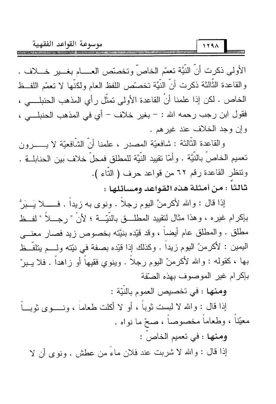 الأولى ذكرتَ أنّ النّيَّة تعمّم الخاصّ وتخصّص العام بغير خلاف. والقاعدة الثّالثة ذكرت أنّ النّيَّة تخصّص اللفظ العام ولكنّها لا تعمّم اللفظ الخاص. لكن إذا علمنا أنّ القاعدة الأولى تمثّل رأي المذهب الحنبلي، فقول ابن رجب رحمه الله: - بغير خلاف - أي في المذهب الحنبلي، وإن وجد الخلاف عند غيرهم.