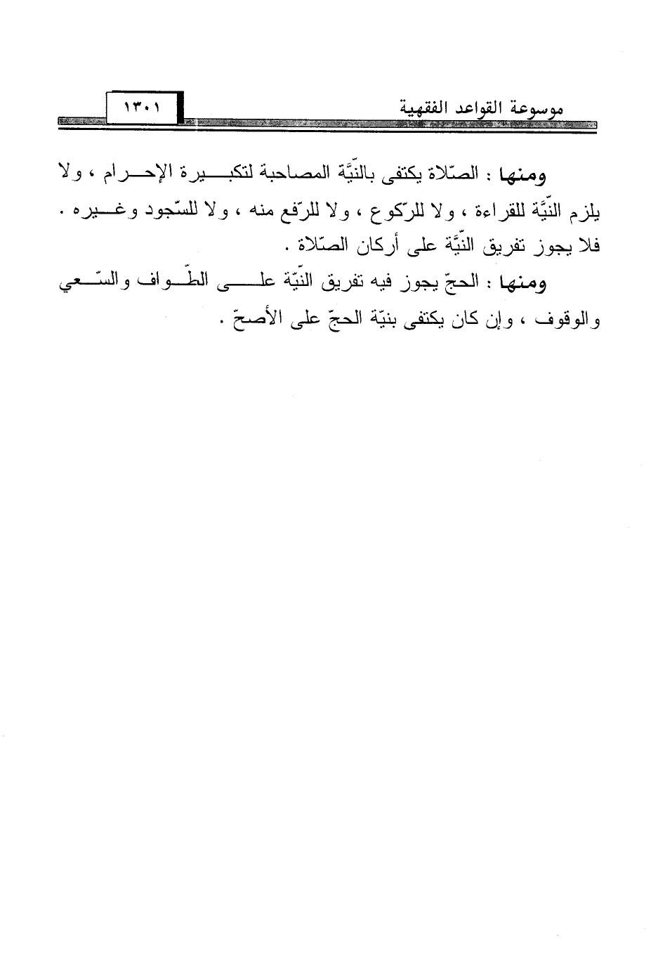 ومنها: الصّلاة يكتفى بالنّيَّة المصاحبة لتكبيرة الإحرام، ولا يلزم النّيَّة للقراءة، ولا للرّكوع، ولا للرّفع منه، ولا للسّجود وغيره. فلا يجوز تفريق النّيَّة على أركان الصّلاة.