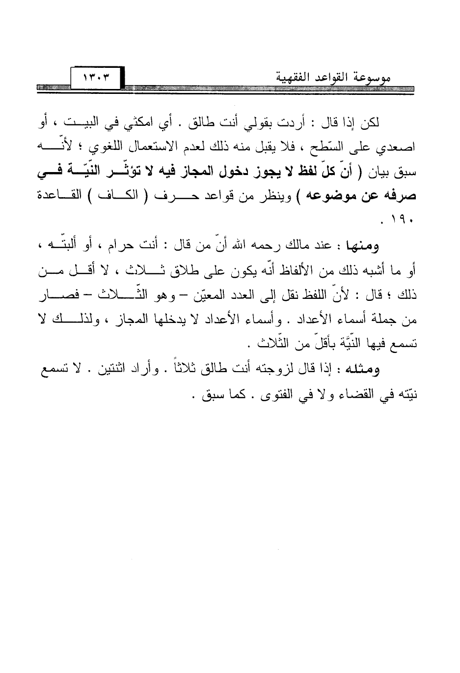 ومنها: عند مالك رحمه الله أنّ من قال: أنت حرام، أو ألبتّه، أو ما أشبه ذلك من الألفاظ أنّه يكون على طلاق ثلاث، لا أقل من ذلك؛ قال: لأنّ اللفظ نقل إلى العدد المعيّن - وهو الثّلاث - فصار من جملة أسماء الأعداد. وأسماء الأعداد لا يدخلها المجاز، ولذلك لا تسمع فيها النّيَّة بأقلّ من الثّلاث.