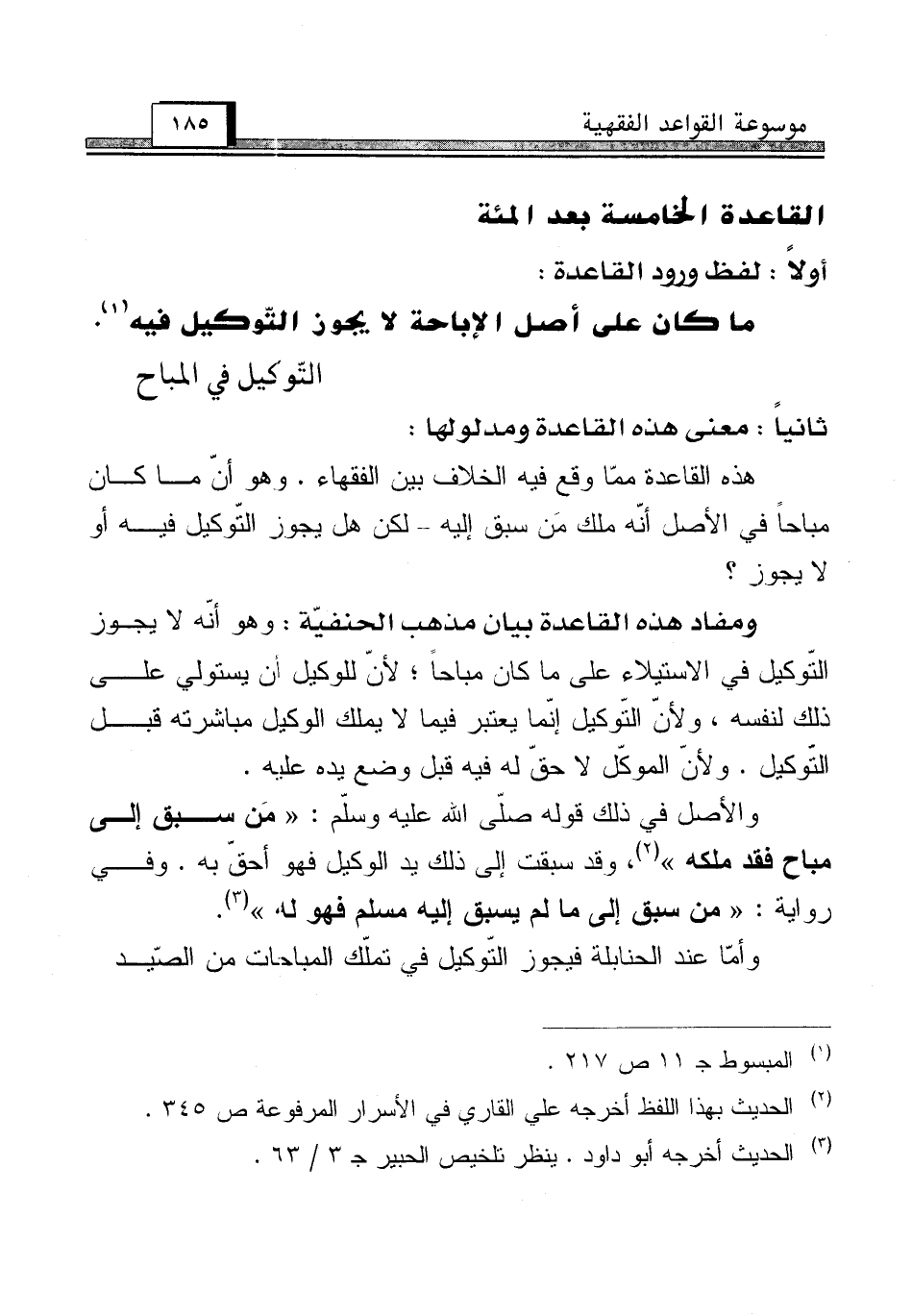 هذه القاعدة ممّا وقع فيه الخلاف بين الفقهاء. وهو أنّ ما كان مباحاً في الأصل أنّه ملك مَن سبق إليه - لكن هل يجوز التّوكيل فيه أو لا يجوز؟