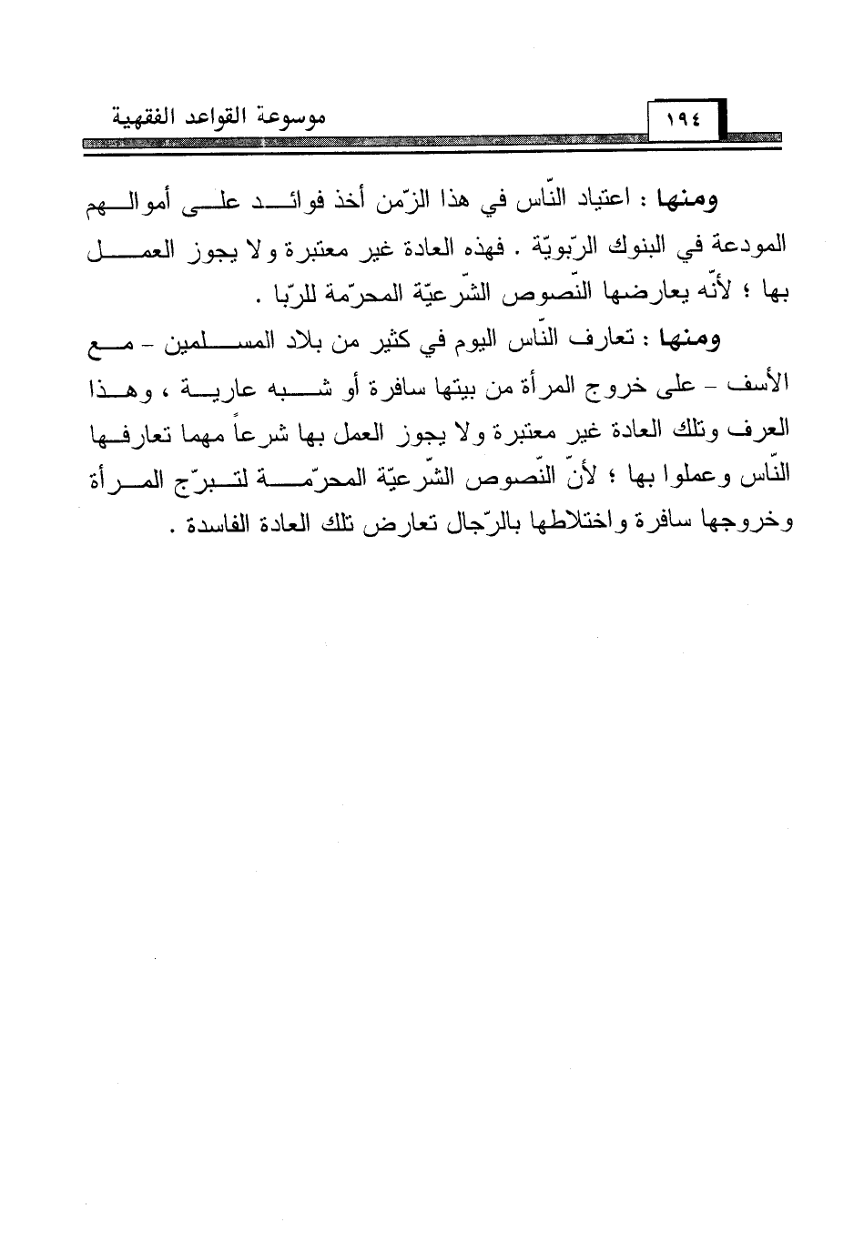 ومنها: اعتياد النّاس في هذا الزّمن أخذ فوائد في على أموالهم المودعة في البنوك الرّبويّة، فهذه العادة غير معتبرة ولا يجوز العمل بها؛ لأنّه يعارضها النّصوص الشّرعيّة المحرّمة للرّبا.