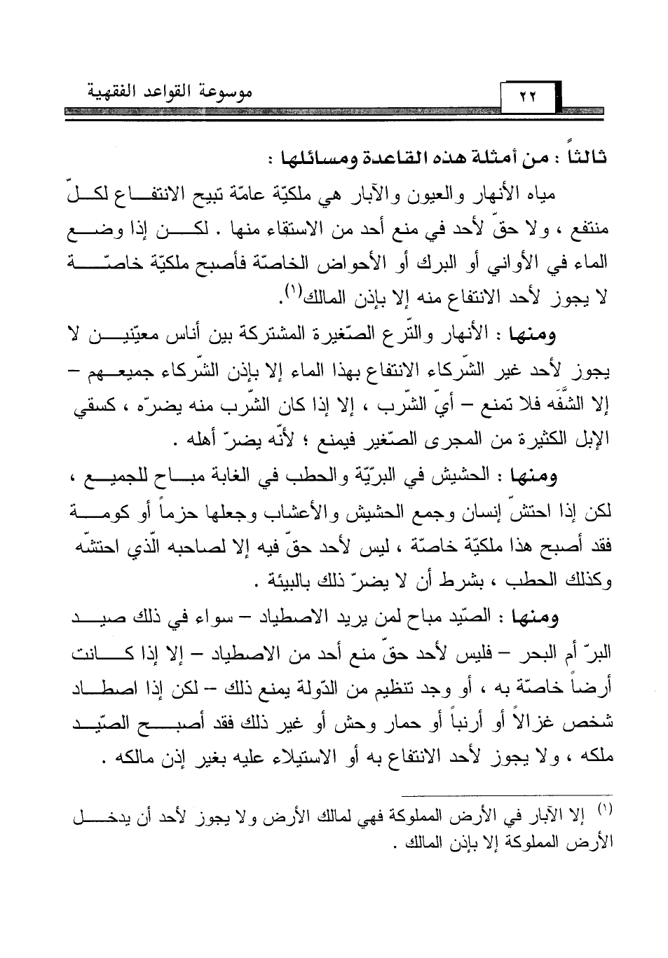 مياه الأنهار والعيون والآبار هي ملكيّة عامّة تبيح الانتفاع لكلّ منتفع، ولا حقّ لأحد في منع أحد من الاستقاء منها. لكن إذا وضع الماء في الأواني أو البرك أو الأحواض الخاصّة فأصبح ملكيّة خاصّة لا يجوز لأحد الانتفاع منه إلا بإذن المالك (¬1).
