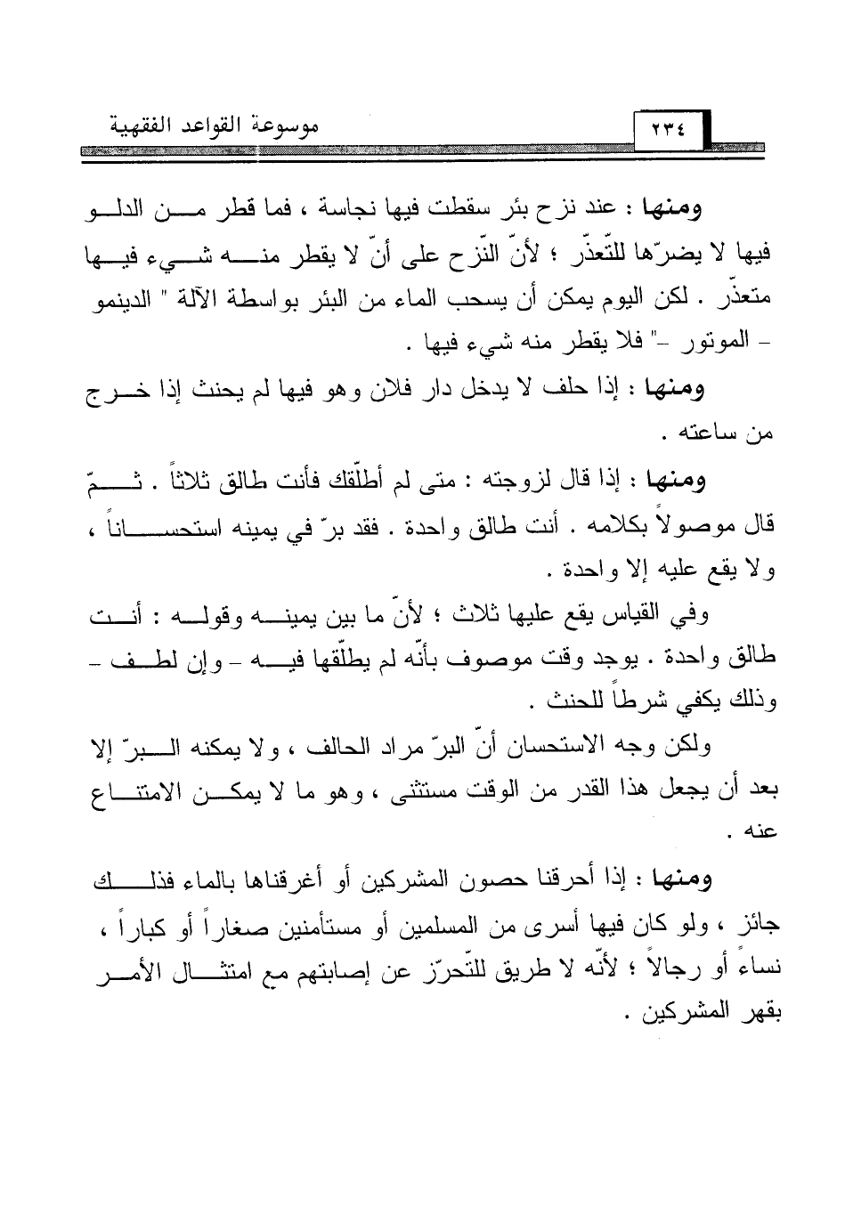 ومنها: عند نزح بئر سقطت فيها نجاسة، فما قطر من الدلو فيها لا يضرّها للتّعذّر؛ لأنّ النّزح على أنّ لا يقطر منه شيء فيها متعذّر. لكن اليوم يمكن أن يسحب الماء من البئر بواسطة الآلة "الدينمو - الموتور -" فلا يقطر منه شيء فيها.