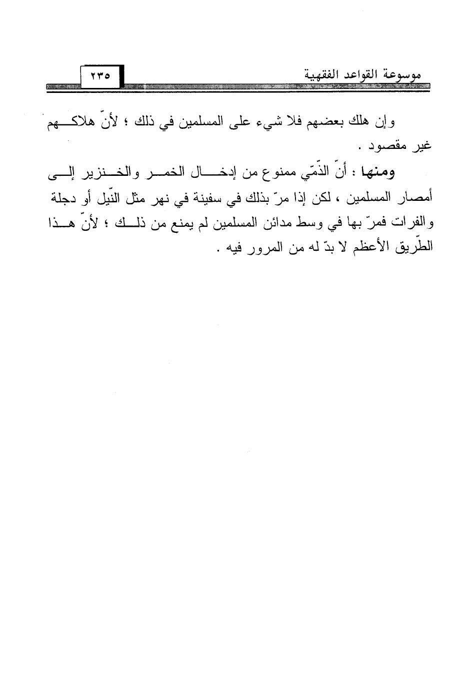 ومنها: أنّ الذّمّي ممنوع من إدخال الخمر والخنزير إلى أمصار المسلمين، لكن إذا مرّ بذلك في سفينة في نهر مثل النّيل أو دجلة والفرات فمرّ بها في وسط مدائن المسلمين لم يمنع من ذلك؛ لأنّ هذا الطّريق الأعظم لا بدّ له من المرور فيه.