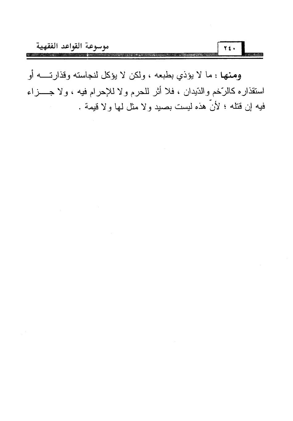ومنها: ما لا يؤذي بطبعه، ولكن لا يؤكل لنجاسته وقذارته أو استقذاره كالرّخم والدّيدان، فلا أثر للحرم ولا للإحرام فيه، ولا جزاء فيه إن قتله؛ لأنّ هذه ليست بصيد ولا مثل لها ولا قيمة.