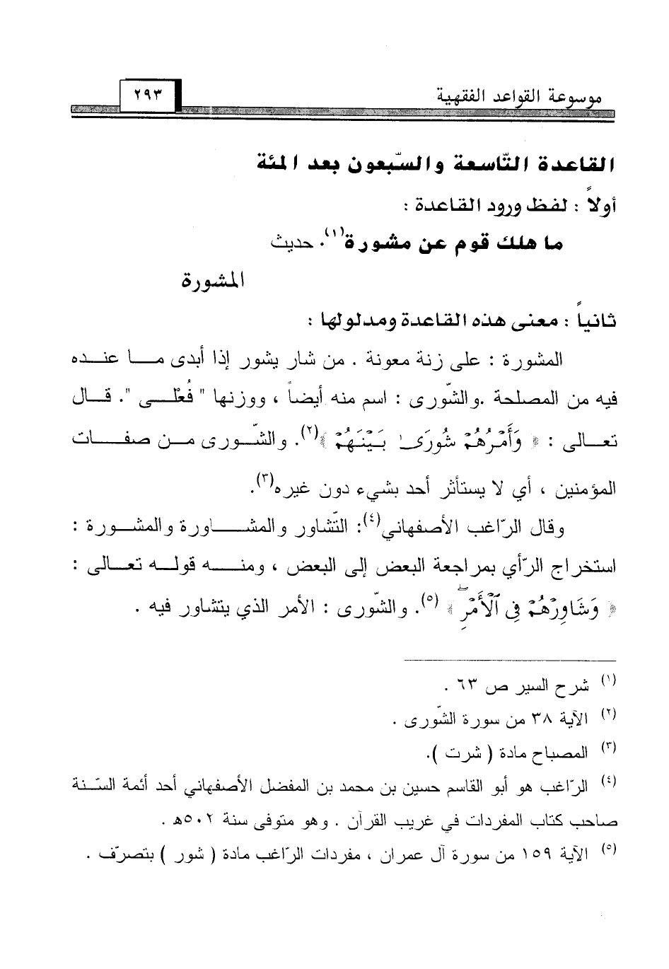 وقال الرّاغب الأصفهاني (¬4): التّشاور والمشاورة والمشورة: استخراج الرّأي بمراجعة البعض إلى البعض، ومنه قوله تعالى: {وَشَاوِرْهُمْ فِي الْأَمْرِ} (¬5). والشّورى: الأمر الذي يتشاور فيه.