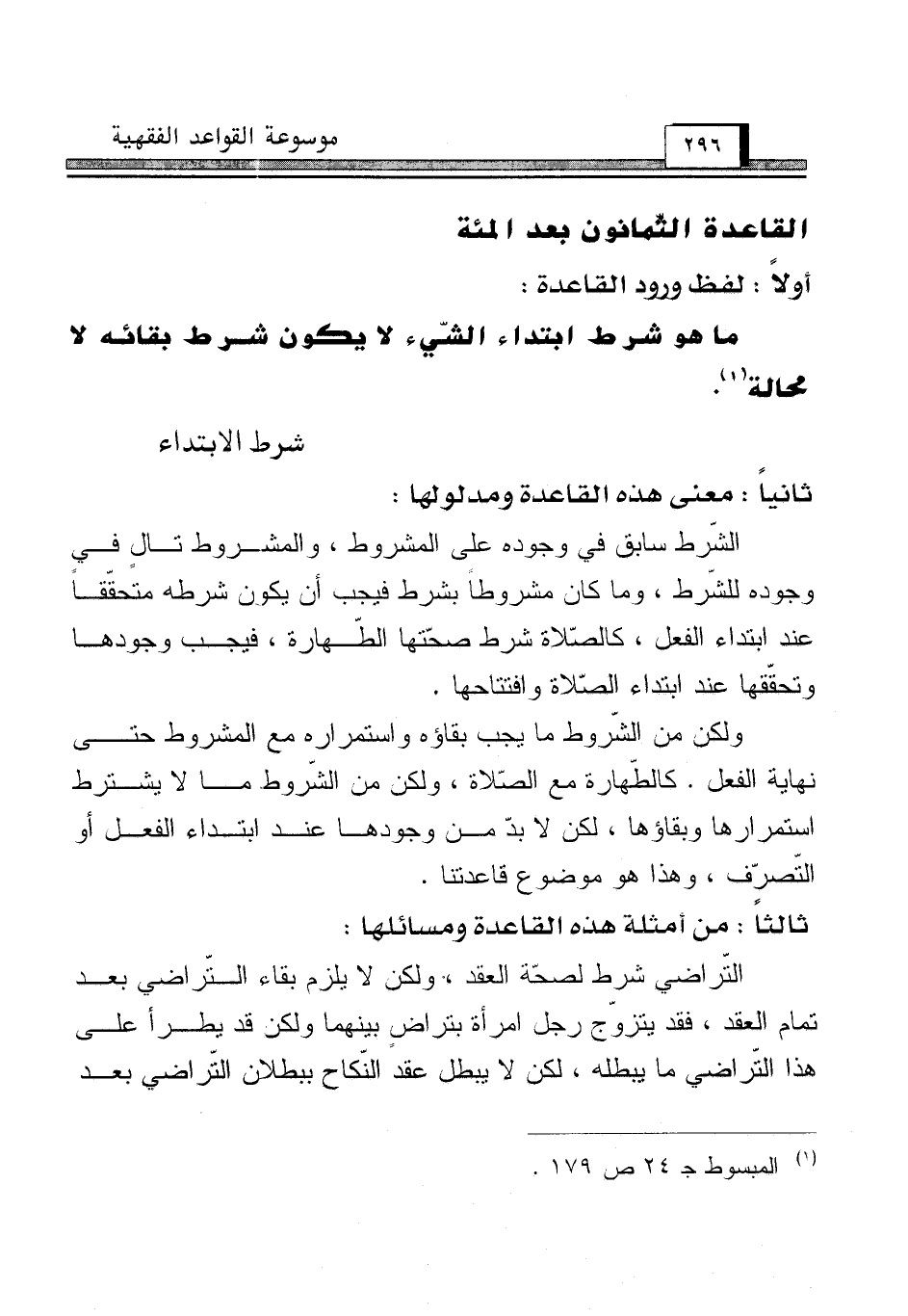 ولكن من الشّروط ما يجب بقاؤه واستمراره مع المشروط حتى نهاية الفعل. كالطّهارة مع الصّلاة، ولكن من الشّروط ما لا يشترط استمرارها وبقاؤها، لكن لا بدّ من وجودها عند ابتداء الفعل أو التّصرّف، وهذا هو موضوع قاعدتنا.