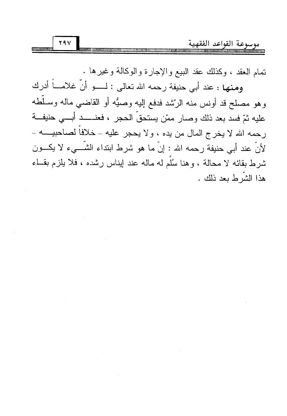 ومنها: عند أبي حنيفة رحمه الله تعالى: لو أنّ غلاماً أدرك وهو مصلح قد أونس منه الرّشد فدفع إليه وصيُّه أو القاضي ماله وسلّطه عليه ثمّ فسد بعد ذلك وصار ممّن يستحقّ الحجر، فعند أبي حنيفة رحمه الله لا يخرج المال من يده، ولا يحجر عليه - خلافاً لصاحبيه - لأنّ عند أبي حنيفة رحمه الله: إنّ ما هو شرط ابتداء الشّيء لا يكون شرط بقائه لا محالة، وهنا سُلَّم له ماله عند إيناس رشده، فلا يلزم بقاء هذا الشّرط بعد ذلك.