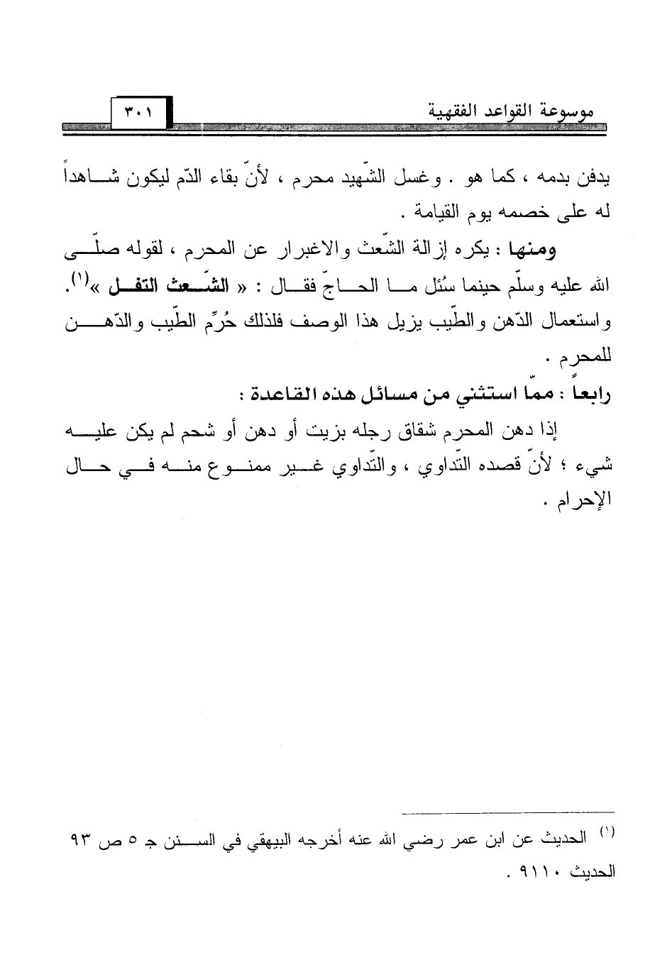ومنها: يكره إزالة الشّعث والاغبرار عن المحرم، لقوله صلّى الله عليه وسلّم حينما سُئل ما الحاجّ فقال: "الشّعث التفل" (¬1). واستعمال الدّهن والطّيب يزيل هذا الوصف فلذلك حُرِّم الطّيب والدّهن للمحرم.