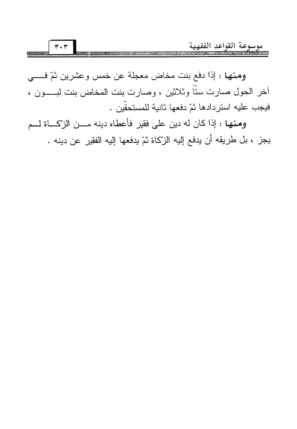 ومنها: إذا دفع بنت مخاض معجلة عن خمس وعشرين ثمّ في آخر الحول صارت ستّاً وثلاثين، وصارت بنت المخاض بنت لبون، فيجب عليه استردادها ثمّ دفعها ثانية للمستحقّين.