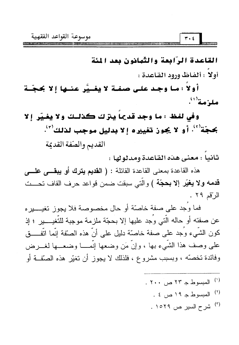 هذه القاعدة بمعنى القاعدة القائلة: (القديم يترك أو يبقى على قدمه ولا يغيّر إلا بحجّة) والّتي سبقت ضمن قواعد حرف القاف تحت الرّقم 29.