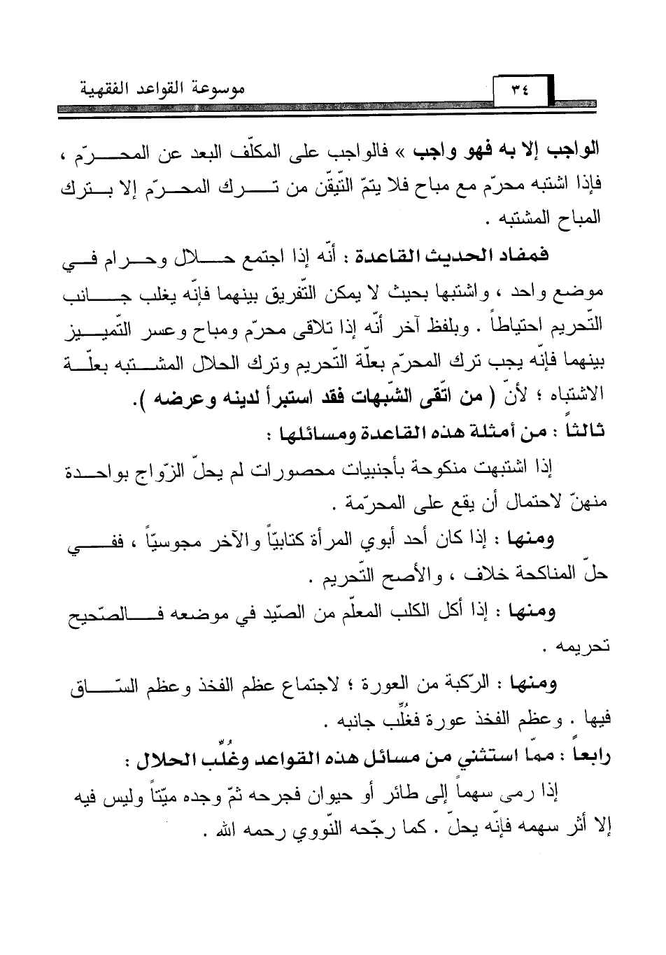 الواجب إلا به فهو واجب" فالواجب على المكلّف البعد عن المحرّم، فإذا اشتبه محرّم مع مباح فلا يتمّ التّيقّن من ترك المحرّم إلا بترك المباح المشتبه.