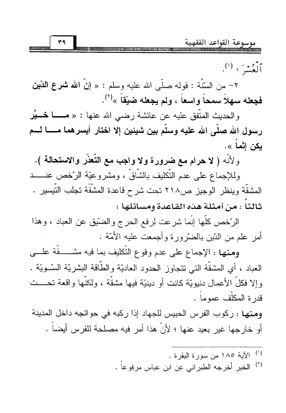 وللإجماع على عدم التّكليف بالشّاقّ، ومشروعيّة الرّخص عند المشقّة وينظر الوجيز ص 218 تحت شرح قاعدة المشّقّة تجلب التّيسير.
