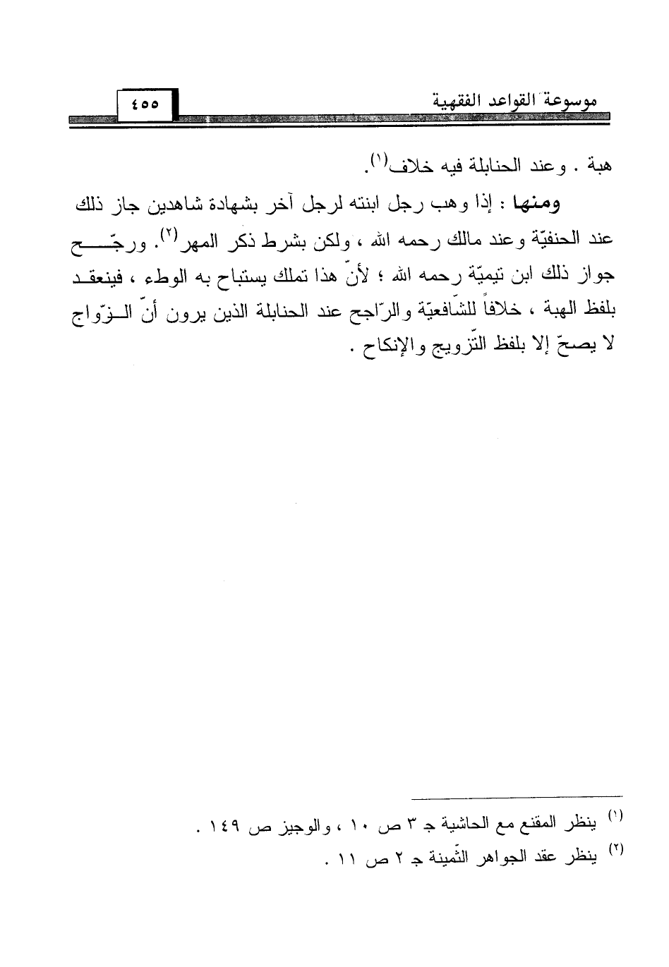 ومنها: إذا وهب رجل ابنته لرجل آخر بشهادة شاهدين جاز ذلك عند الحنفيّة وعند مالك رحمه الله، ولكن بشرط ذكر المهر (¬2). ورجّح جواز ذلك ابن تيميّة رحمه الله؛ لأنّ هذا تملك يستباح به الوطء، فينعقد بلفظ الهبة، خلافاً للشّافعيّة والرّاجح عند الحنابلة الذين يرون أنّ الزّواج لا يصحّ إلا بلفظ التّزويج والإنكاح.