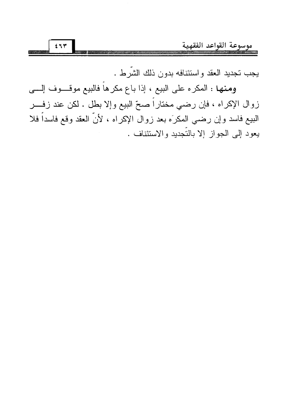 ومنها: المكره على البيع، إذا باع مكرهاً فالبيع موقوف إلى زوال الإكراه، فإن رضي مختاراً صحّ البيع وإلا بطل. لكن عند زفر البيع فاسد وإن رضي المكرَه بعد زوال الإكراه, لأنّ العقد وقع فاسداً فلا يعود إلى الجواز إلا بالتّجديد والاستئناف.