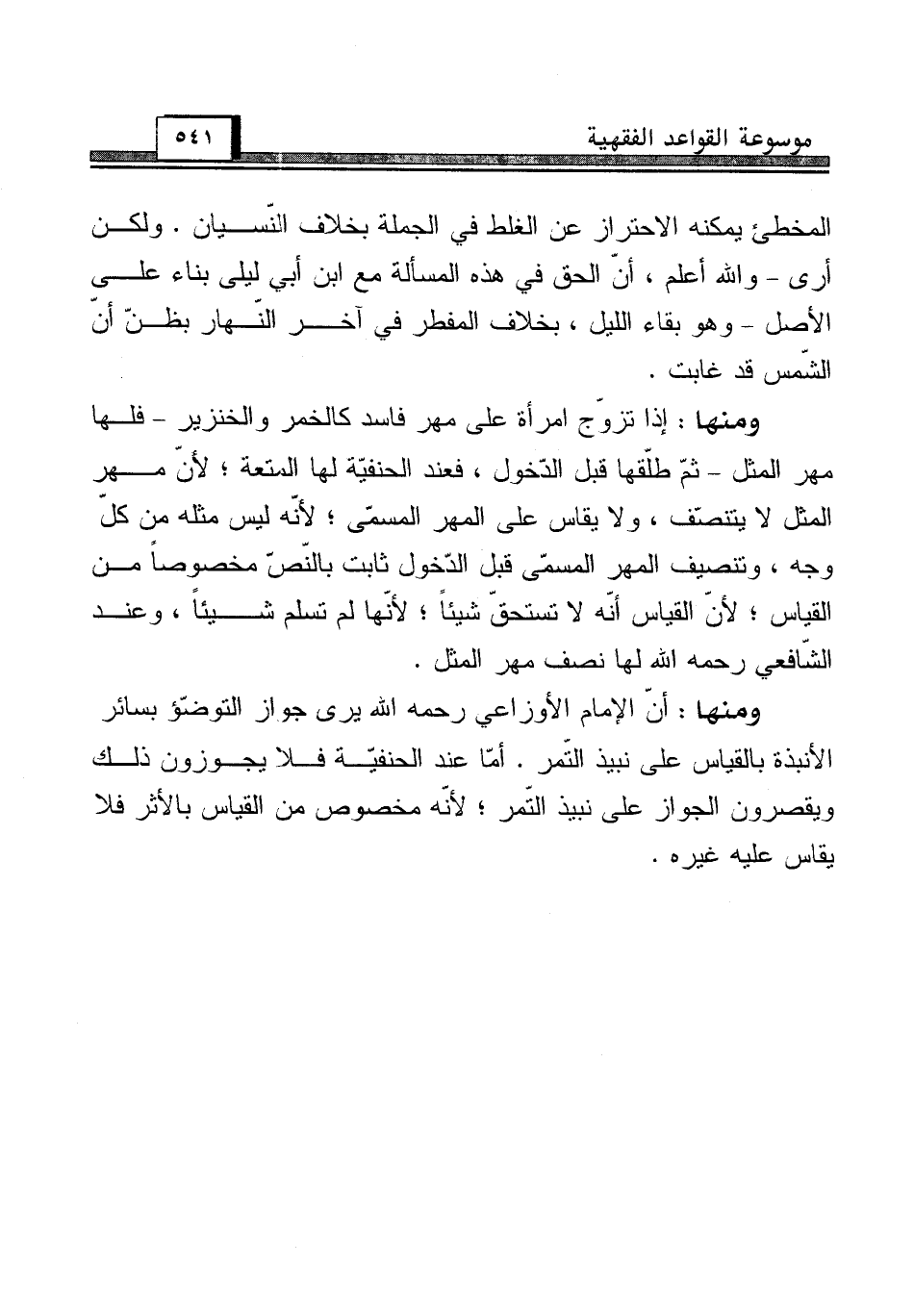 ومنها: إذا تزوّج امرأة على مهر فاسد كالخمر والخنزير - فلها مهر المثل - ثمّ طلّقها قبل الدّخول، فعند الحنفيّة لها المتعة؛ لأنّ مهر المثل لا يتنصّف، ولا يقاس على المهر المسمّى؛ لأنّه ليس مثله من كلّ وجه، وتنصيف المهر المسمّى قبل الدّخول ثابت بالنّصّ مخصوصاً من القياس؛ لأنّ القياس أنّه لا تستحقّ شيئاً؛ لأنّها لم تسلم شيئاً، وعند الشّافعي رحمه الله لها نصف مهر المثل.