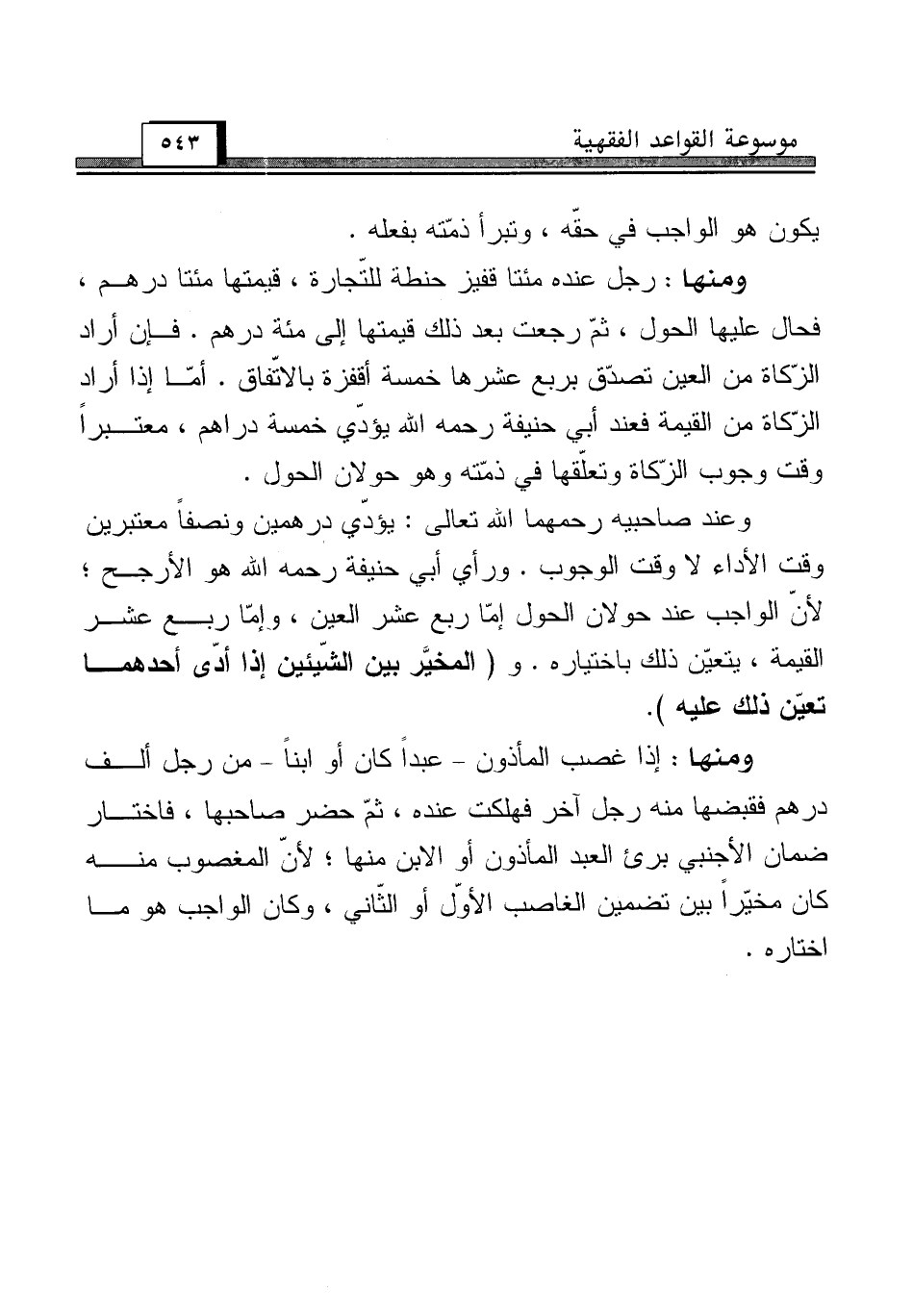 ومنها: رجل عنده مئتا قفيز حنطة للتّجارة، قيمتها مئتا درهم، فحال عليها الحول، ثمّ رجعت بعد ذلك قيمتها إلى مئة درهم. فإن أراد الزّكاة من العين تصدّق بربع عشرها خمسة أقفزة بالاتّفاق. أمّا إذا أراد الزّكاة عن القيمة فعند أبي حنيفة رحمه الله يؤدّي خمسة دراهم، معتبراً وقت وجوب الزّكاة وتعلّقها في ذمّته وهو حولان الحول.