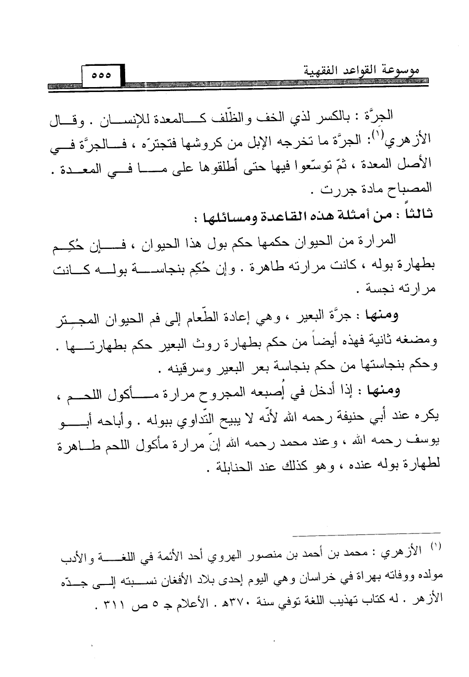 ومنها: جرَّة البعير، وهي إعادة الطّعام إلى فم الحيوان المجتر ومضغه ثانية فهذه أيضاً من حكم بطهارة روث البعير حكم بطهارتها. وحكم بنجاستها من حكم بنجاسة بعر البعير وسرقينه.